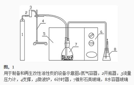 實驗在250毫升的錐形石英玻璃中進行(圖1)。圖中顯示了用于再生活性炭的實驗裝置(圖1)。再生之后,活性炭根據最優(yōu)化的吸附條件。在這些條件下,活性炭的再生在幾次吸附之后進行1至10次再生循環(huán)幾次。活性炭的再生在氮氣流下進行(圖1)以避免活性炭的破壞。在我們以前的研究中,我們調查了改性活性炭的微波再生的最佳條件。活性炭根據最佳條件進行再生。