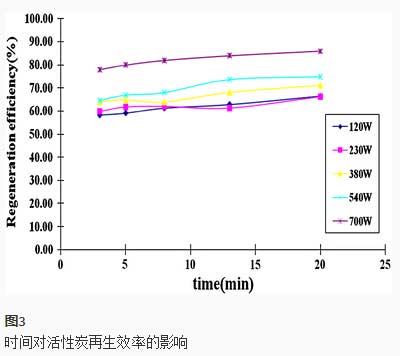 經過研究發(fā)現了活性炭再生的最佳條件。在700 W微波照射功率和3 min照射時間下,改性活性炭的再生效率可達98%左右。